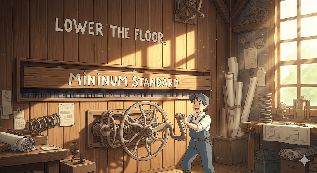 어떤 수치, 기준(standard), 또는 최소 요구 수준(level)을 '인위적으로 낮추거나(lower the floor)' '높이는' 행위를 의미합니다. '최저선'(lower limit) 또는 '기대치'(expectation)를 조정하는 것에 초점이 맞춰져 있습니다.