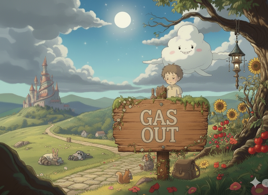 - 해설: 차량 연료가 바닥난 상황 또는 비유적으로 체력 소진.