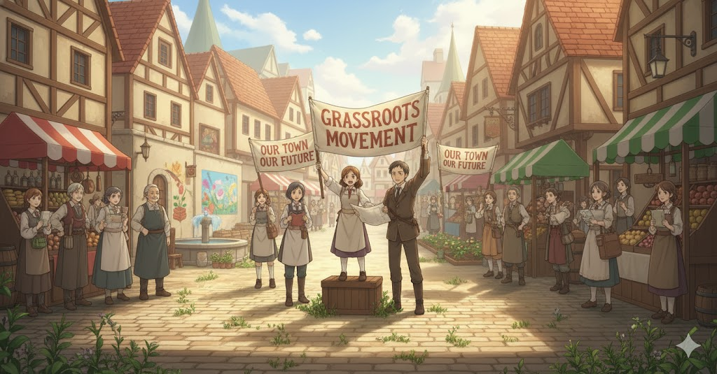 '일반 대중(grassroots)', 즉 '대다수(majority)의 평범한 **시민'**이 자발적으로 시작(start)하고 추진하는 사회적 또는 정치적 변화(change) 운동을 의미합니다. '기성 권력이나 엘리트 집단에 의해 주도되지 않는 민중 주체의 **활동'**에 초점이 맞추어져 있습니다.