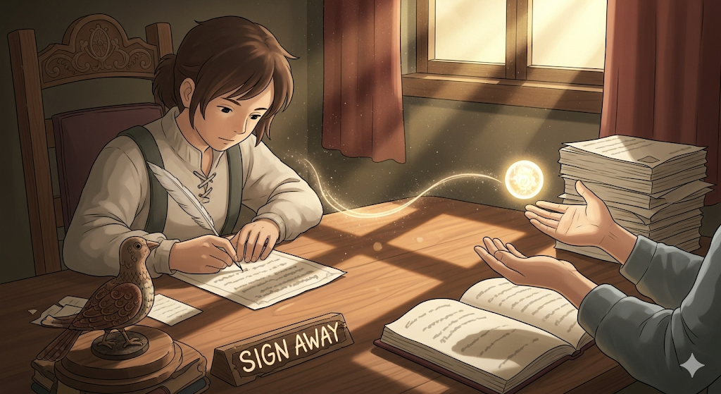 법률(legal) 문서(document)에 서명(sign)하여 '자신의 권리(rights), 재산(property), 또는 소유권(ownership)을 영구적으로 포기하고 다른 사람에게 넘겨주는 **행위'**를 의미합니다. '법적인 서명을 통한 권리 **포기'**에 초점이 맞추어져 있습니다.