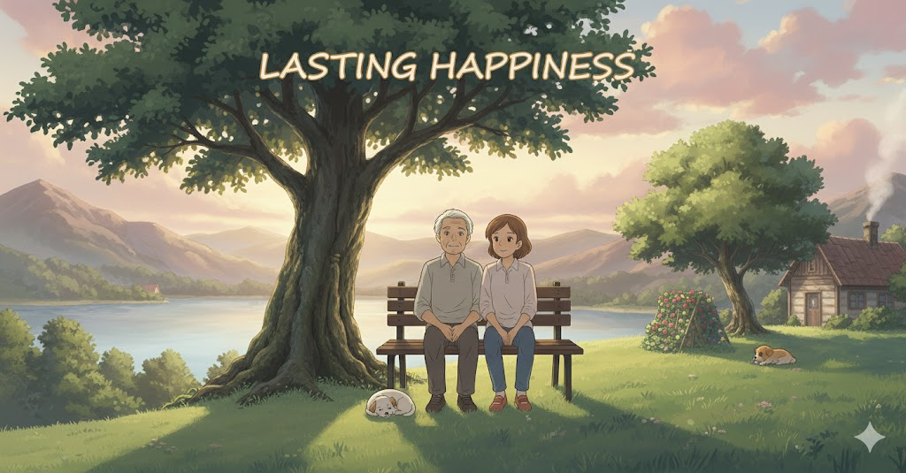 | true/lasting | 진정한/지속적인 | 형용사로, '행복' '의' '질'. | '행복' '이' '깊고' '진실' '되거나' '시간' '에' '걸쳐' '유지' '됨' '을' '강조함'. |