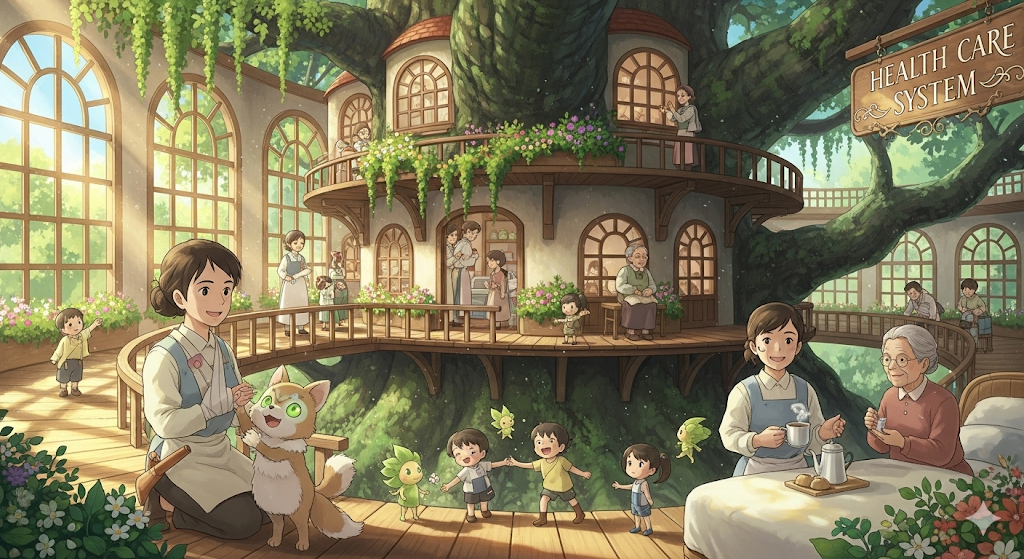 국가(government)나 사회(society)가 국민(citizen)들의 건강(health) 관리를 위해 제공하는 모든 기관(hospital), 인력(doctor), 시설(facility), 그리고 정책(policy)을 포괄하는 체계를 의미합니다. '국가 차원의 의료 지원 **구조'**에 초점이 맞추어져 있습니다.