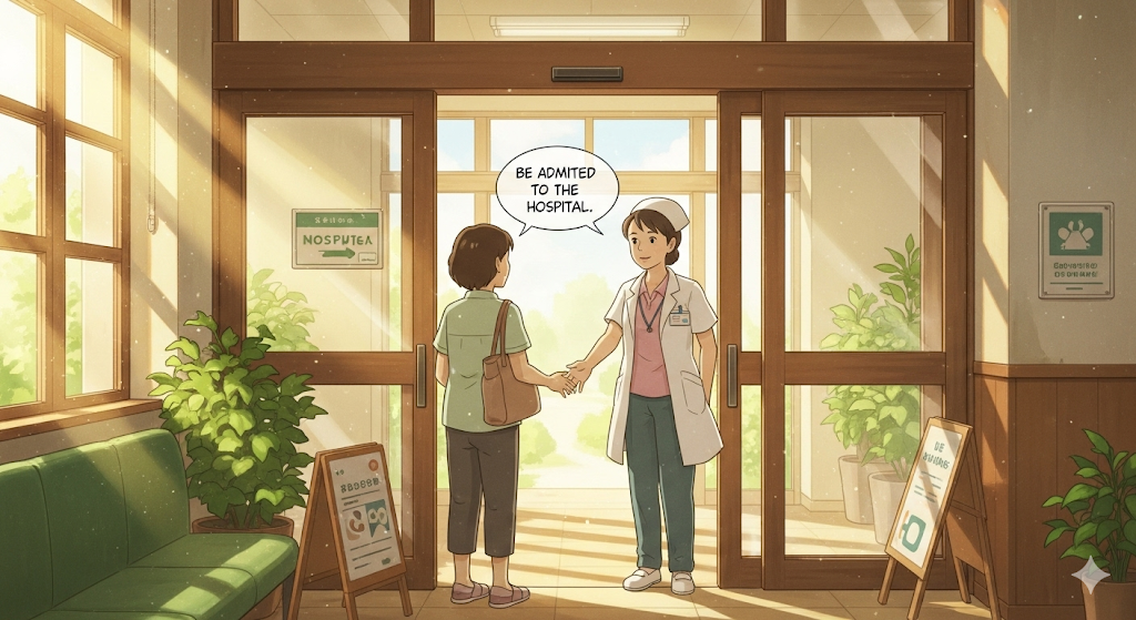의사의 결정(decision)에 따라 환자가 치료나 관찰을 위해 병원(hospital)의 병동으로 공식적으로 들어가는 행위를 의미합니다. '입원이라는 **공식적인 절차'**에 초점이 맞추어져 있으며, 이는 상태(condition)가 심각하거나 장기적인 치료가 필요함을 시사합니다.