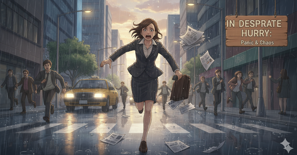 어떤 일이나 행동을 시간(time) 제약이나 촉박함 때문에 '매우 빠르게 또는 조급하게' 진행하는 상태를 의미합니다. **'시간 부족으로 인한 급박한 움직임'**에 초점이 맞추어져 있으며, 종종 **'부주의(lack of care)'**나 **'실수(error)'**의 원인이 됩니다.