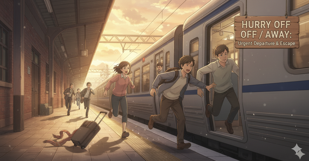 - hurry off/away