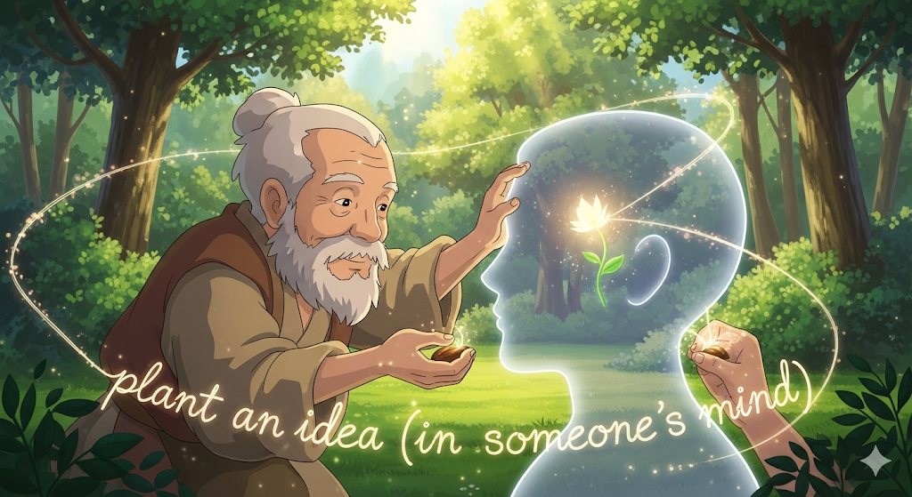 **어떤 아이디어(idea), 의견(opinion), 또는 의도(intention)를 '다른 사람(someone)의 마음(mind) 속에 은근히 또는 교묘하게 심어주어, 그 사람이 스스로 생각해 냈다고 믿게 하는 행위'**를 의미합니다. **'타인의 사고(thought)에 영향을 미치는 은밀하고 전략적인 행위'**에 초점이 맞추어져 있습니다.