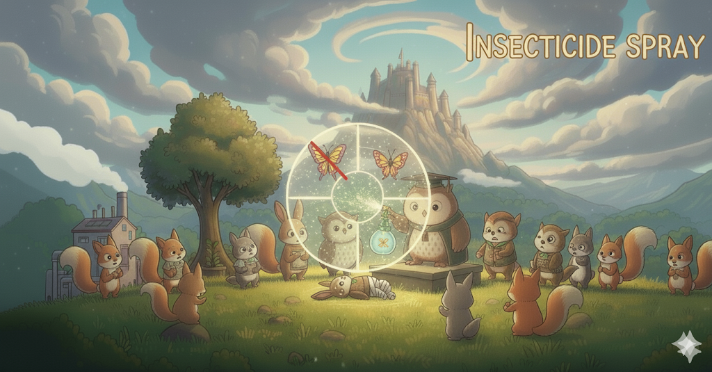 농작물(crops), 가정, 또는 공공 장소의 해충(pest insect)을 '죽이기 위해(cide)' 사용되는 화학 물질을 스프레이(spray) 형태로 분사하는 도구(instrument)나 물질을 의미합니다. **'곤충의 개체 수(population)를 줄여 피해(damage)를 막는 직접적인 통제(control) 수단'**에 초점이 맞추어져 있습니다.