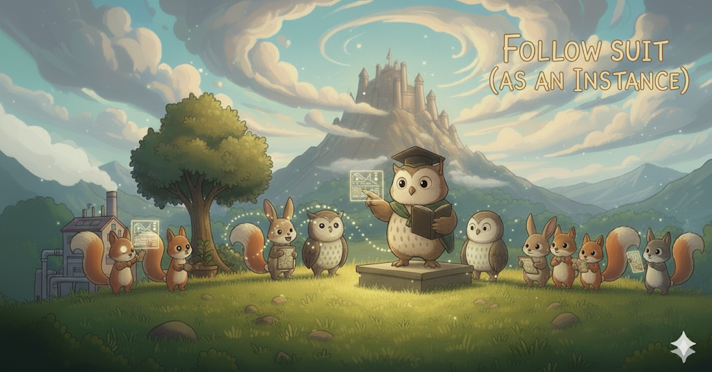 **어떤 사람이나 집단이 먼저 행동하거나 결정(decision)했을 때, 다른 사람이나 집단이 그 행동이나 방침을 '따라서 실행하는 행위'**를 의미합니다. **'모범(instance)을 보고 유사한 행동을 취하는 모방적 행동'**에 초점이 맞추어져 있으며, 종종 **'추세(trend)나 유행(fashion)에 합류하는 것'**을 뜻합니다.