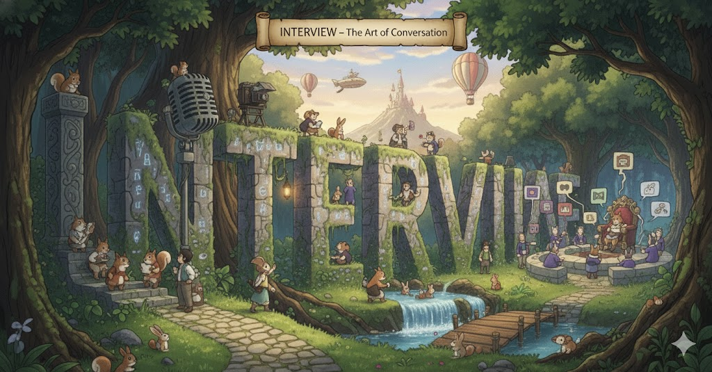 - *‘interview’**는 특정 목적(직원 채용, 정보 수집 등)을 위해 두 명 이상이 만나 질문하고 답변하는 대화이거나, 언론인이 특정 인물과 만나서 대화하고 정보를 얻는 공식적인 자리인 면접, 인터뷰, 회견을 의미하거나, 특정 목적을 위해 질문하고 답변하는 대화를 진행하는 면접하다, 인터뷰하다를 의미합니다.