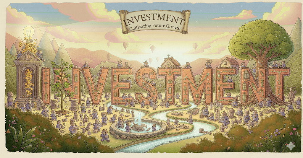 - *‘investment’**는 미래에 이익을 얻을 목적으로 돈, 시간, 노력 등을 투입하는 행위인 투자이거나, 투자된 돈이나 자산인 투자금, 투자액이거나, 투자된 주식, 채권, 부동산 등의 자산인 투자 대상을 의미합니다.