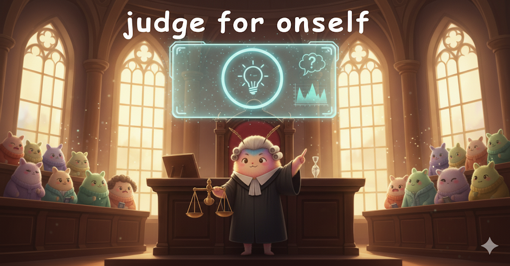 **다른 사람의 의견(opinion)이나 조언(advice)에 의존하지 않고, 자신의 이성, 경험, 그리고 지식에 근거하여 '스스로 최종적인 판단(judgment)을 내리는 행위'**를 의미합니다. **'개인의 독립적인 사고와 결단(decision)'**에 초점이 맞추어져 있습니다.