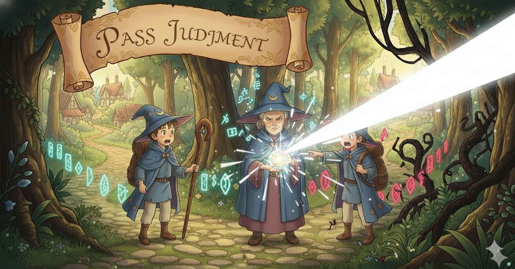 - 해석: 다른 사람이나 그들의 행동에 대해 권위적으로 비판하거나 평가하는 위치에 있다.