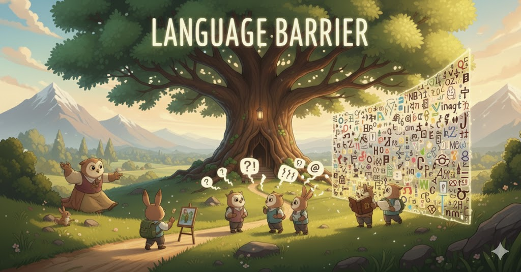- 해석: 사용하는 언어가 달라 의사소통에 어려움을 겪는 상황이나 장애물.