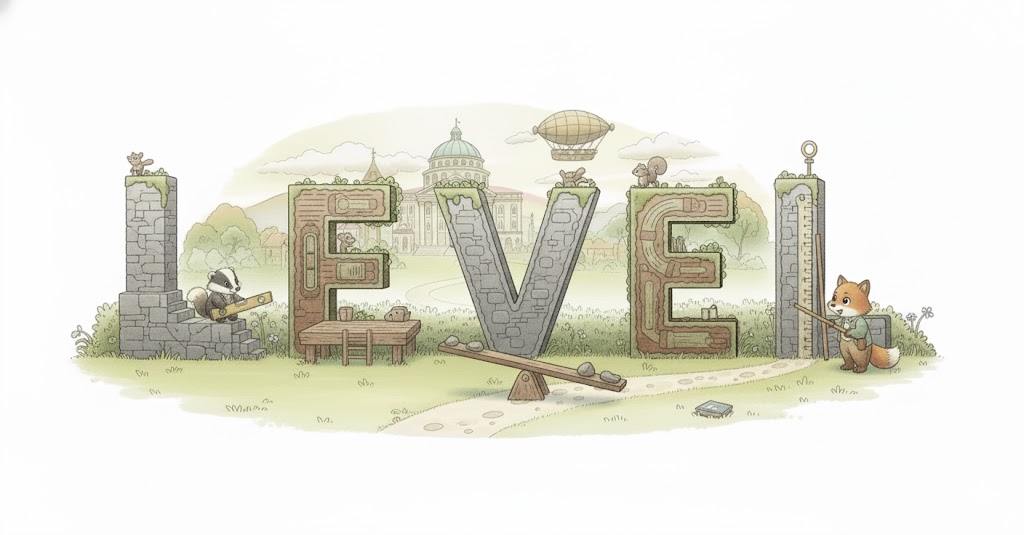 라틴어 libella ("수평기, 작은 저울")에서 유래 → 구 프랑스어 nivel (나중에 niveau)을 거쳐 영어로 유입 → 즉, 원래 **'수평을 맞추는 도구'**를 의미했음 → 이 의미가 현대 영어에서 '기울어지지 않고 평평한 상태' (수평, 평면) 명사로 굳어졌어요. 나아가 이러한 '수평'이나 '높이'라는 개념이 확장되어 '품질, 능력, 중요성 등의 높낮이' (수준, 정도)와 '건물이나 조직의 특정 높이' (층, 단계)를 뜻하게 되었어요.