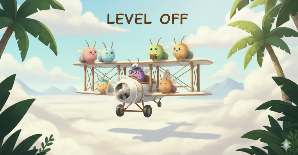 오르거나 내리던 수치, 속도, 또는 활동이 더 이상 변화하지 않고 일정하고 안정적인 수준(level)을 유지하는 상태를 의미합니다. 비행기가 고도를 높이거나 낮추다가 수평 비행으로 전환하는 물리적인 의미에서 유래했으며, **'변동을 멈추고 안정화되는 것'**에 초점이 맞추어져 있습니다.