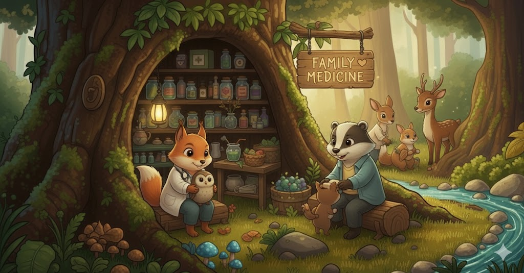 해석: 그는 지역 클리닉에서 일반 진료를 한다.