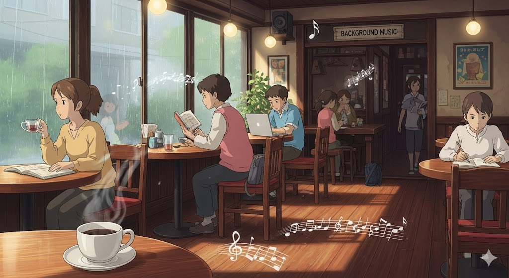 - 해석: 주요 활동에 방해가 되지 않도록 조용히 틀어놓는 음악 (분위기 조성용).