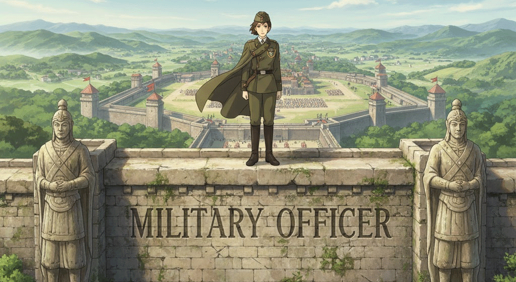 '국가'(nation) 군대'(military) 내에서 '계급'(rank)을 '가지고', '부하'(subordinates) 직원'을 '지휘'(lead)하고, '명령'(order)을 '내리며', '책임'(responsibility)을 '수행'하는 '지위' 있는 군인을 의미합니다. '규율'(discipline)과 '권위'(authority) 체계 내의 '리더십'(leadership) 역할에 초점이 맞춰집니다.