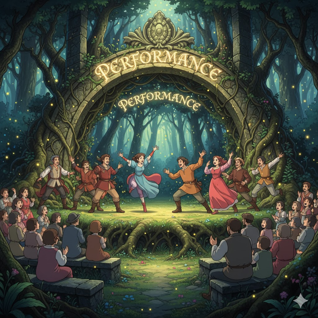 - (명사) 공연, 연주: 대중 앞에서 연기, 음악, 춤 등을 선보이는 행위.