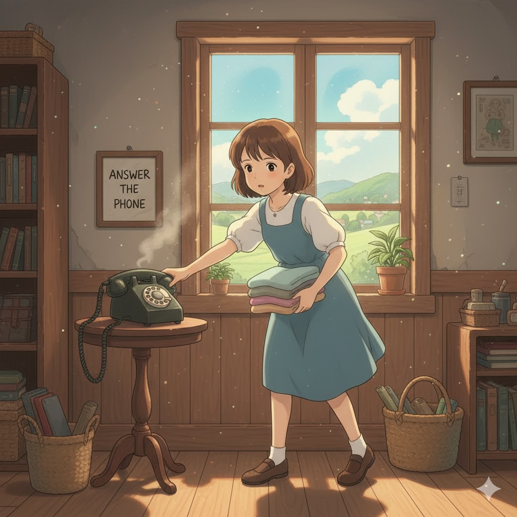 - 해석: 전화 통신을 통해 대화하고 있거나 전화기를 사용하여 어떤 일을 하고 있는 상태.