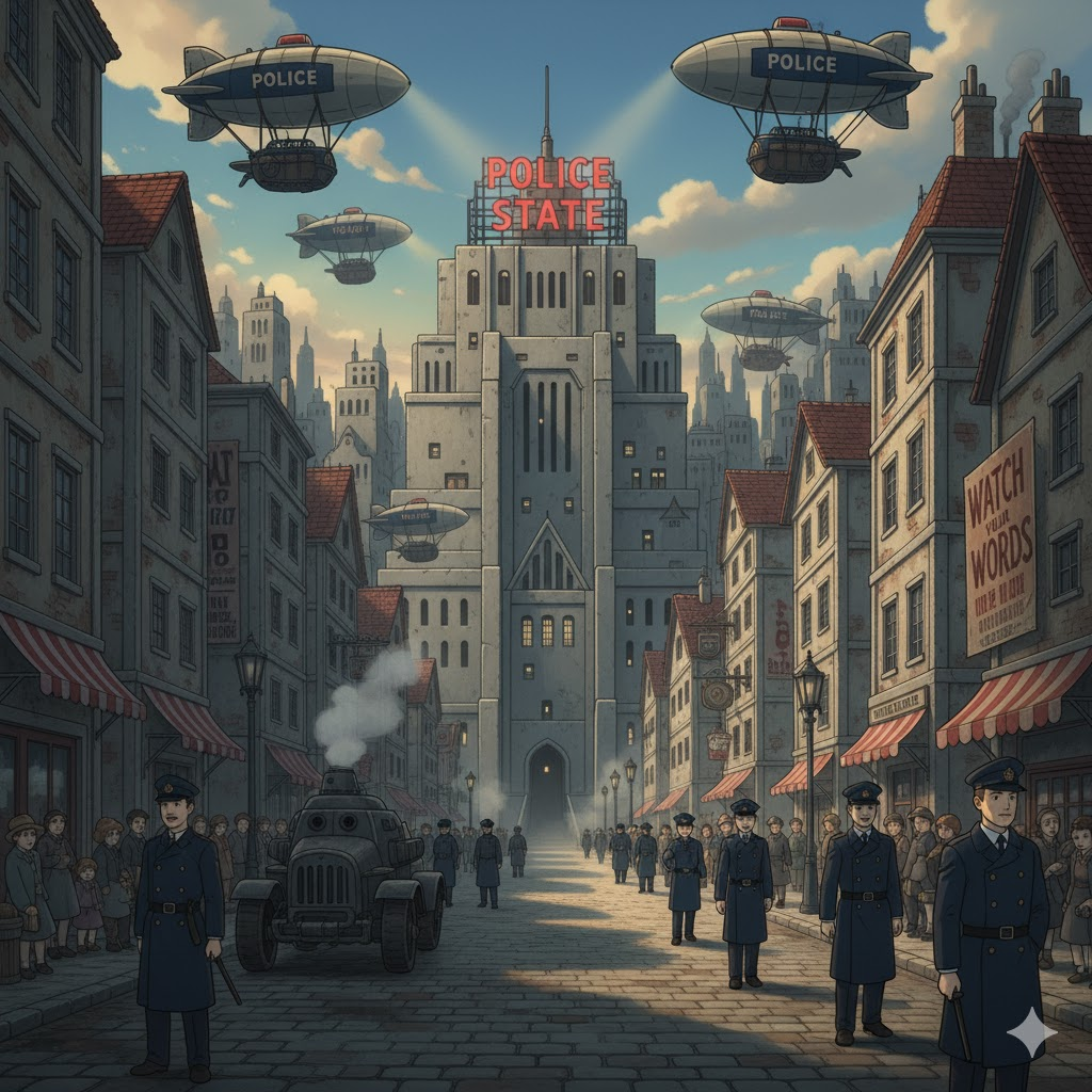 - 해석: 경찰이나 비밀 기관이 시민의 자유를 극도로 억압하고 감시를 통해 통제하는 전체주의적 국가 체제.