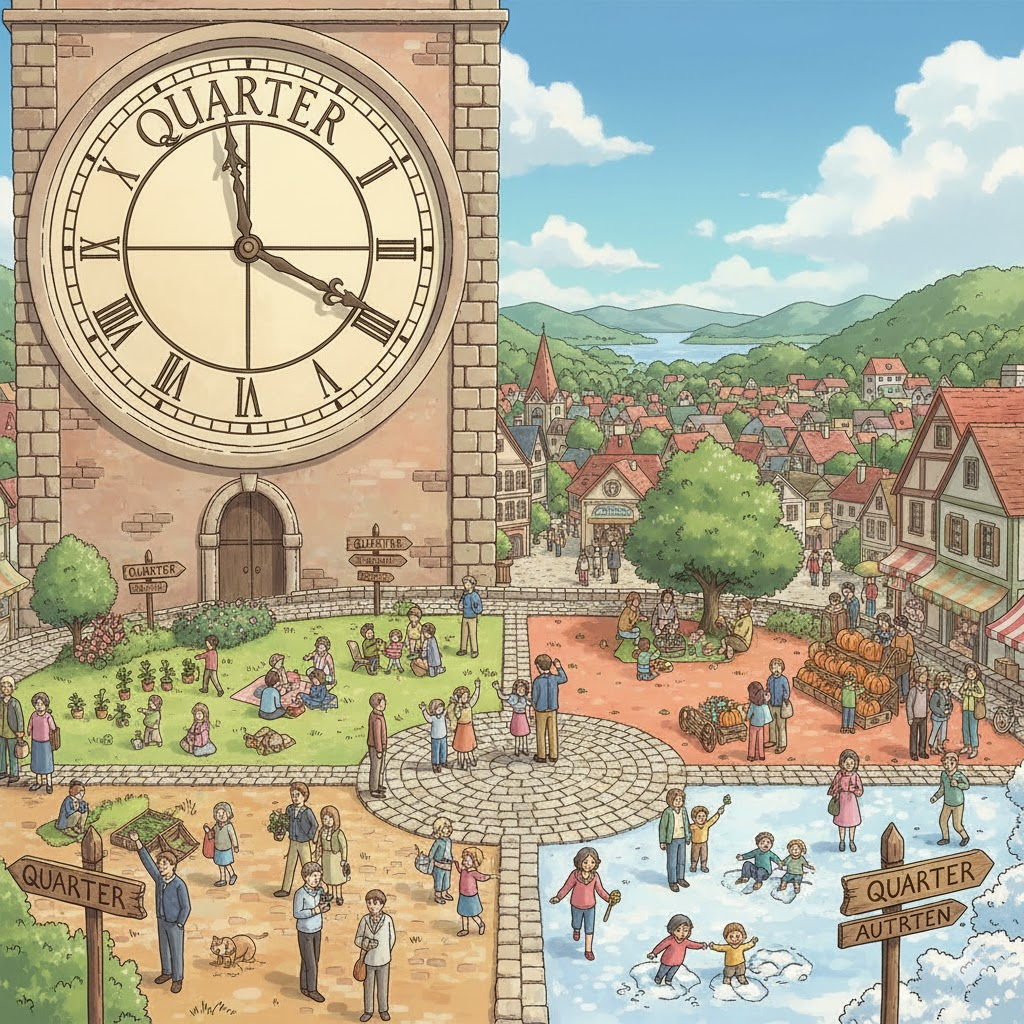 '전체'(whole)를 '네'(four) '등분'(division)한 '부분'(part)을 의미합니다. '1년'(year)을 4등분한 '기간'(time period) (분기), '1시간'(hour)의 4분의 1인 '15분', 또는 '통화'(currency) 단위의 '25센트'와 같은 '측정'(measure)의 '단위'(unit)로 사용됩니다. '재정적'(financial) '보고'(report)나 '시간'(time) 관리에 초점이 맞춰집니다.