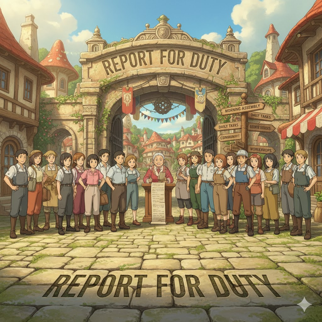 - 예문: New recruits are ordered to report for duty at the training facility at dawn. (신병들은 새벽에 훈련 시설로 임무 수행을 위해 출두하라는 명령을 받았다.)