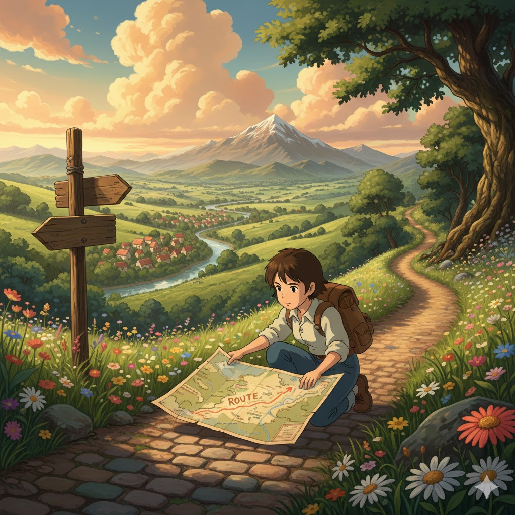 '출발지'(start)에서 '목적지'(end)로 '가기'(go) 위해 '특정'(specific) '길'(road), '방향'(direction), 또는 '이동'(travel) '계획'(plan)을 '선택'(choose)하고 '따르는'(follow) 행위를 의미합니다. '능동적인'(proactive) '선택'과 '결정된'(decided) '방식'(method)에 '따른' '움직임'(movement)을 강조합니다.