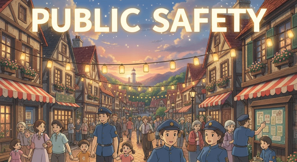 '지역'(area)이나 '국가'(nation)의 '일반'(general) '대중'(public)이 '범죄'(crime), '테러'(terrorism), '재난'(disaster), 또는 '사고'(accident)와 같은 '위협'(threat)으로부터 '보호'(protection)되고 '안녕'(well-being)한 '상태'(state)를 의미합니다. '경찰'(police), '정부'(government), 그리고 '법률'(law)의 '최우선'(top priority) '목표'(goal)를 강조합니다.