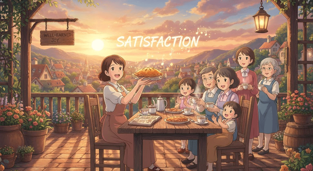 만족, 만족감. 기대나 요구가 충족된 상태에서 느끼는 즐거운 감정.