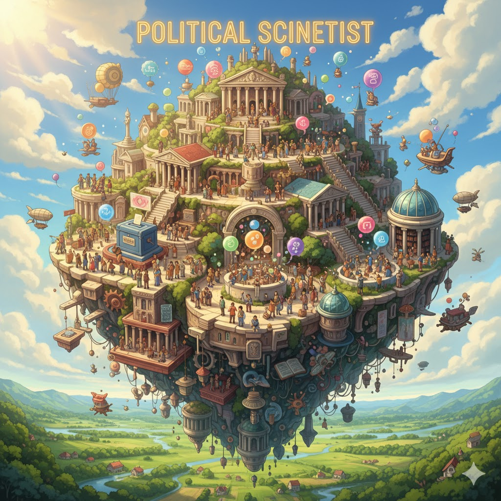 '정치'(politics) '이론'(theory), '정부'(government) '체제'(system), '정치적'(political) '행동'(behavior), 그리고 '국제'(international) '관계'(relation)를 '체계적'(systematic)이고 '분석적'(analytical)인 '방법론'(methodology)을 '사용'(use)하여 '연구'(research)하는 '학자'(scholar)를 의미합니다. '권력'(power), '정의'(justice), 그리고 '공공'(public) '정책'(policy)의 '문제'(issue)를 '탐구'(study)하는 '사회'(social) '과학자'(scientist)를 강조합니다.