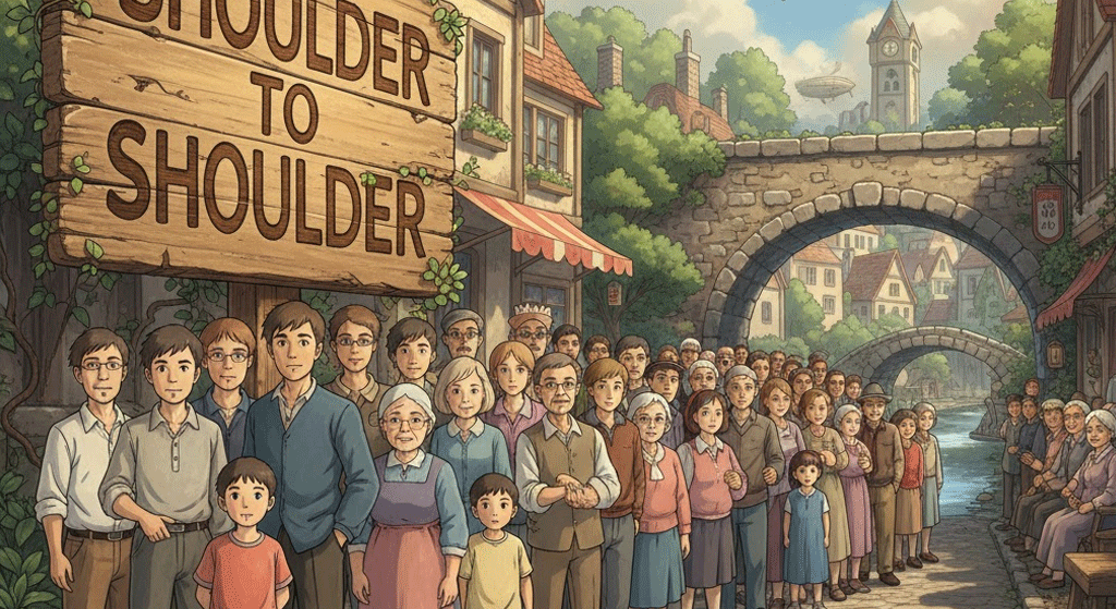 - 예문: The community worked shoulder to shoulder to clean up the park after the storm. (지역 사회는 폭풍 후 공원을 청소하기 위해 어깨를 맞대고 협력했다.)