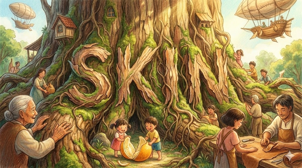 | 고대 노르웨이어 skinn (벗겨낸 가죽) | "겉을 감싸는 층" | 사람의 피부 → 동물의 가죽 → 과일/채소의 껍질 → 껍질을 벗기다/까지다 |