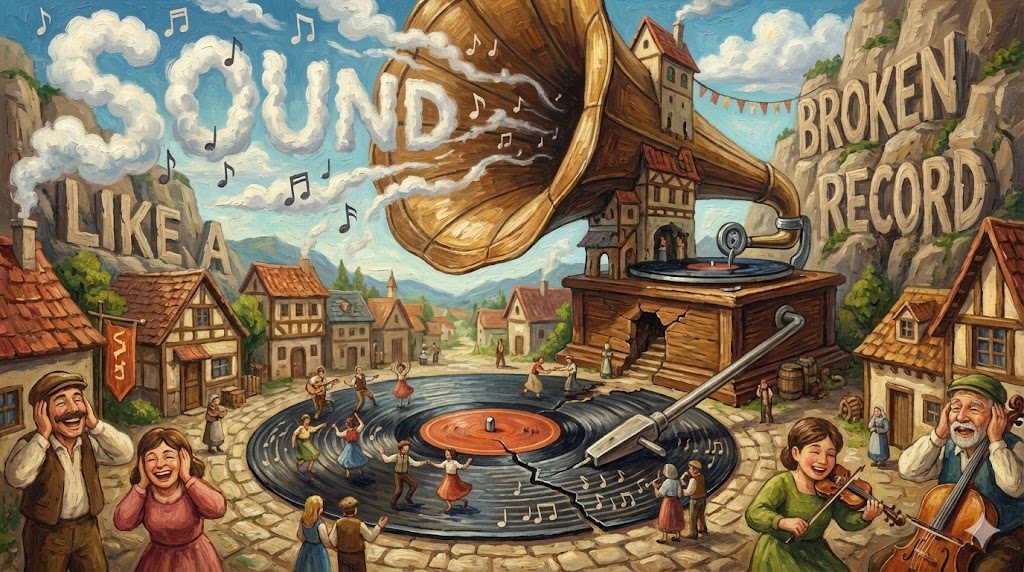 과거의 바이닐 레코드판이 긁히면 바늘이 튀어 같은 구간만 계속 재생하던 현상에서 유래했습니다. 상대방이 이미 알고 있는 내용을 지겹도록 반복해서 말할 때 사용하는 비유적인 표현입니다.