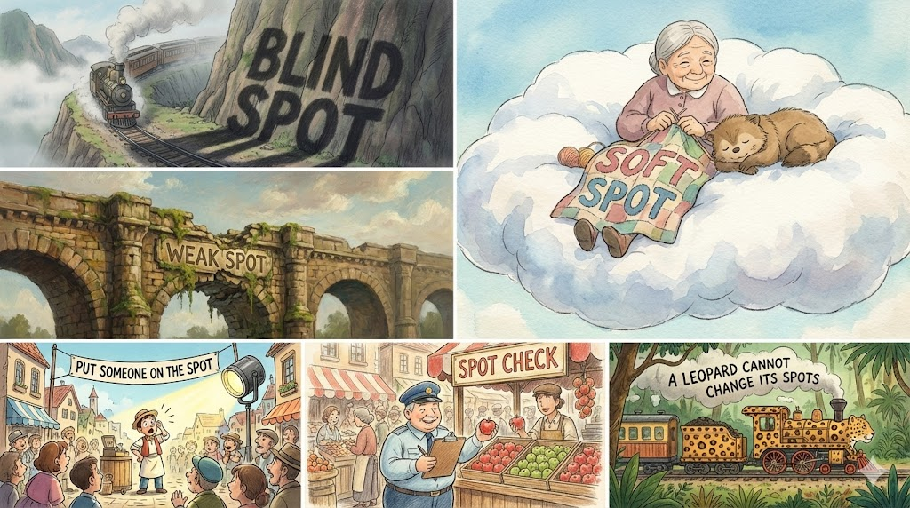 'blind spot'은 사각지대를, 'soft spot'은 애착을, 'put on the spot'은 난처하게 함을, 'spot check'는 불시 점검을 나타냅니다.