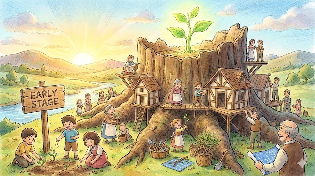 - 해석: 발전이나 진행 과정의 시작 부분. (initial phase와 유사)