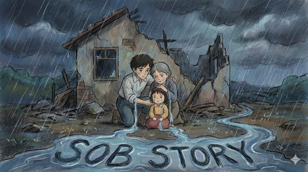 - 해석: 동정이나 도움을 얻기 위해 꾸며내거나 과장한 슬픈 이야기. (부정적 맥락)