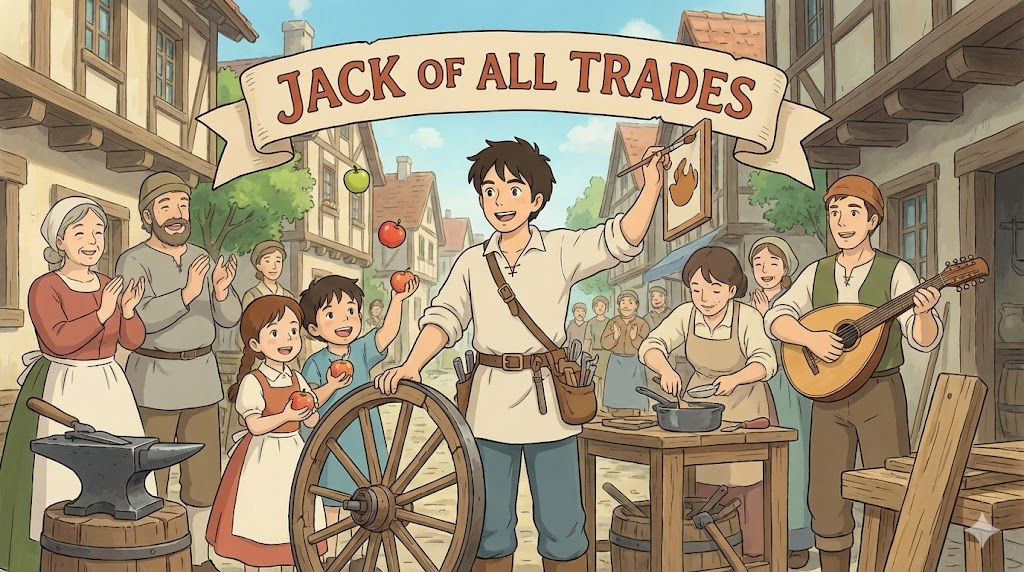 - 해석: 여러 가지 일을 다 잘하는 사람 (때로는 "Master of none(한 가지 정통한 것은 없다)"이 덧붙여져 깊이가 없음을 의미하기도 함).
