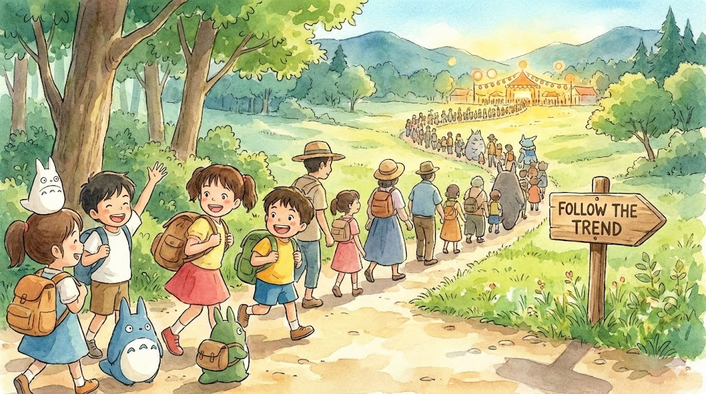일반적인 경향이나 유행하는 방식을 그대로 따라가는 행위를 의미합니다. 동조(conformity)의 뉘앙스를 가지며, 안정적이거나 대중적인 선택을 할 때 사용됩니다.