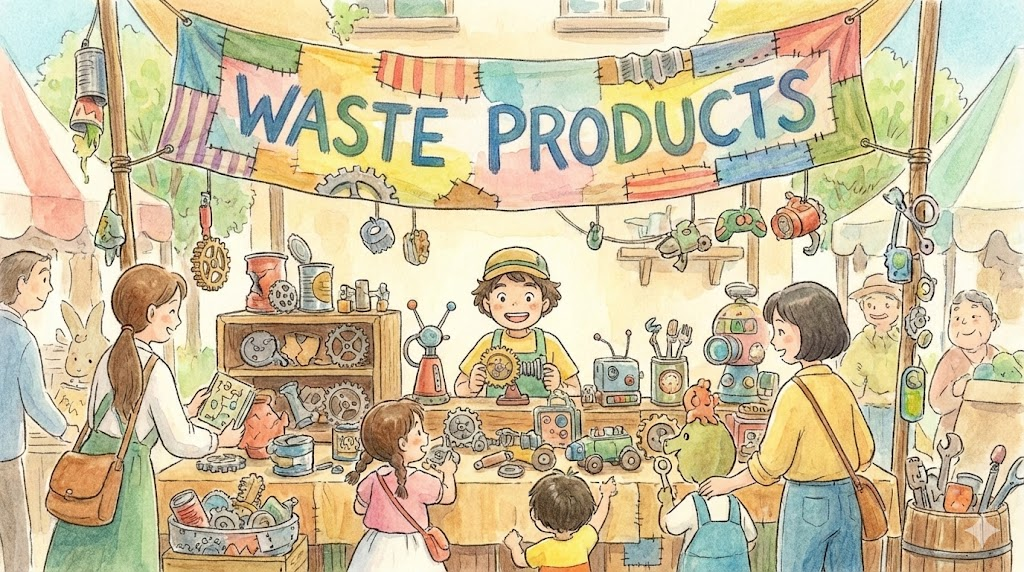 생산 과정(산업)이나 생물학적 대사 과정(인체)을 거친 후 남겨진 불필요하거나 쓸모없는 물질을 의미합니다. 공장에서는 폐기물을, 인체에서는 소변, 이산화탄소 등을 가리킵니다.