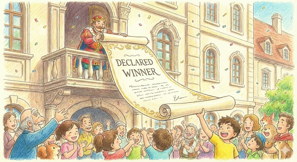 - 해석: 공식적인 절차나 심사를 거쳐 최종적으로 발표된 승리자.