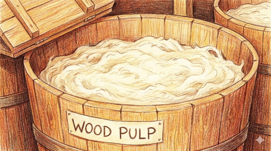 - 해석: 나무 섬유를 분리하여 종이나 판지를 만드는 데 사용되는 주재료. (제지 산업, 환경 지문에서 중요)
