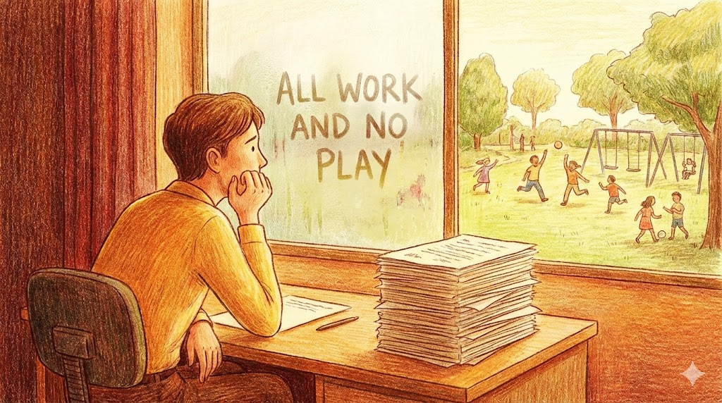 오로지 일(work)만 하고 휴식이나 오락(play)이 전혀 없는 상태를 비판하는 숙어입니다. 이러한 생활 방식이 사람을 지루하고 불행하게 만들며(유명한 속담: All work and no play makes Jack a dull boy), 건강한 균형의 필요성을 암시합니다.