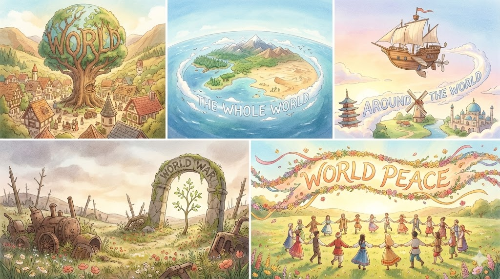 'world'는 '지구상의 모든 나라와 사람들을 포함하는' '세상 전체'를 의미하는 가장 기본적인 단어입니다. 'the whole world'는 '모든 사람, 모든 장소'를 포함하는 '전체성'을 강조합니다. 'around the world'는 '지구의 모든 지역을 통과하여', '전 세계를 통틀어'라는 의미를 나타냅니다. 'world war'는 '여러 주요 국가들이 참여하는' '대규모의 국제 전쟁'을 의미합니다. 'world peace'는 '전쟁이나 분쟁 없이' '모든 나라가 평화로운 상태'를 의미합니다.