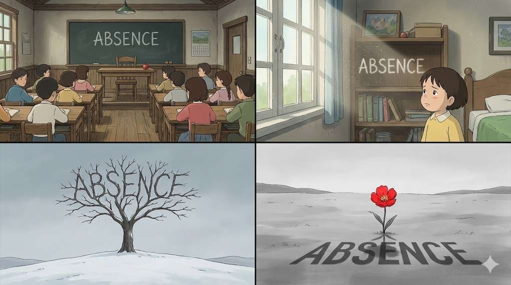 absence는 물리적으로 그 자리에 없다는 뜻에서 출발하여, 추상적인 개념이나 사물의 결핍까지 아우르는, 존재의 비어있음을 나타내는 단어입니다.