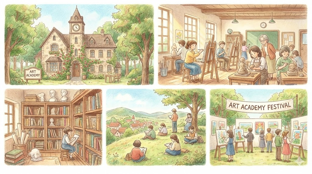 회화, 조각, 디자인 등 시각 예술을 전문적으로 가르치는 기관입니다. 입시를 위한 미술 학원부터 전문 예술가를 양성하는 고등 교육 기관까지 폭넓게 사용됩니다.
