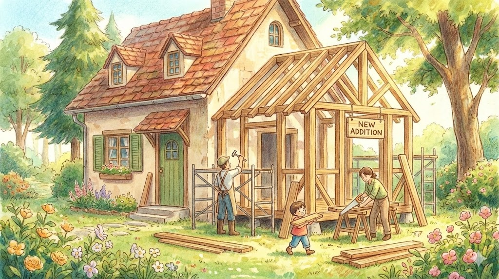 기존 주택에 방, 차고, 혹은 2층 등을 새로 지어 붙여 거주 공간을 확장하는 공사 자체를 의미합니다.