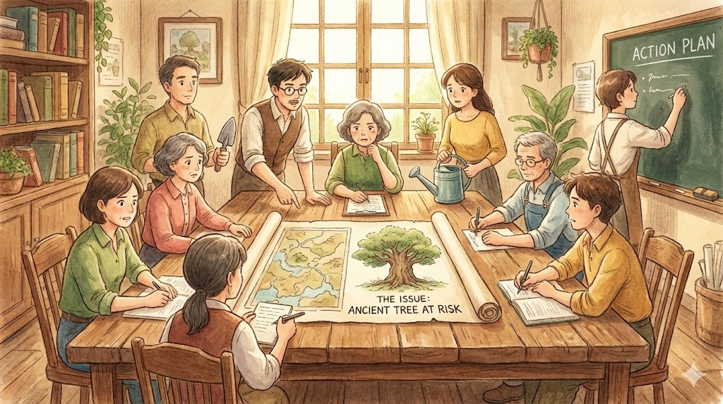 - 해석: 어려운 상황이나 쟁점에 대해 관심을 갖고 해결책을 찾으려 노력하는 행위입니다.