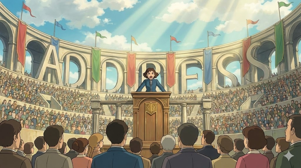 | 명사 (N.) | 연설 | (Formal) 공식적인 자리에서 하는 말. | The president gave a televised address. (대통령은 텔레비전 연설을 했다.) |