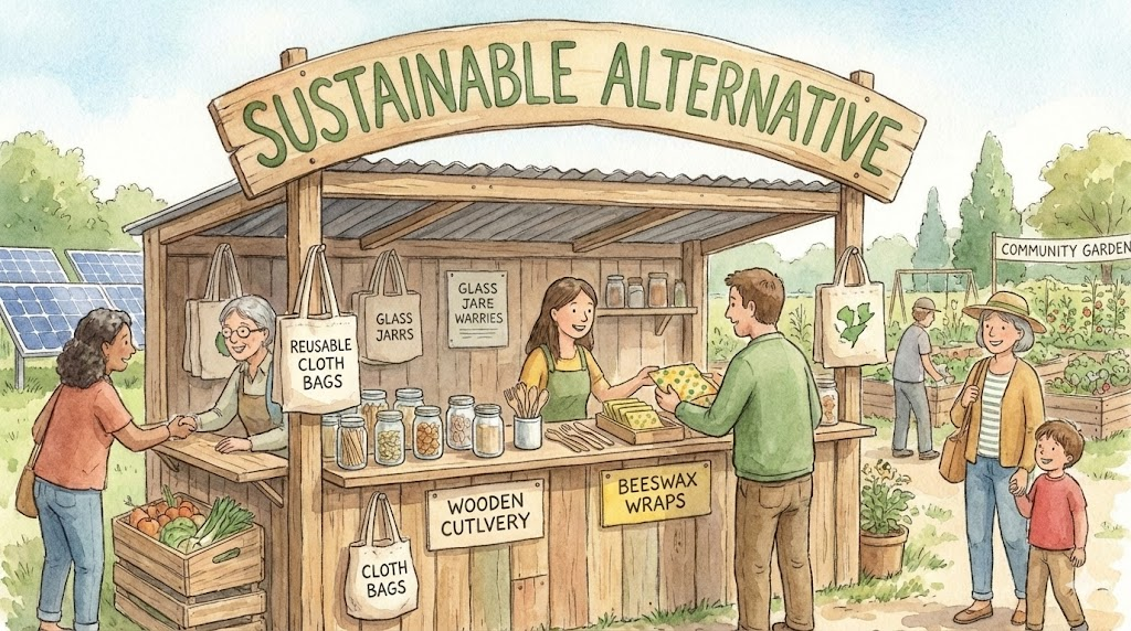 환경을 파괴하지 않고 미래에도 계속 사용할 수 있는 대안을 말합니다. 주로 일회용품이나 환경 오염 물질을 대체하는 친환경 제품이나 방식을 설명할 때 씁니다.